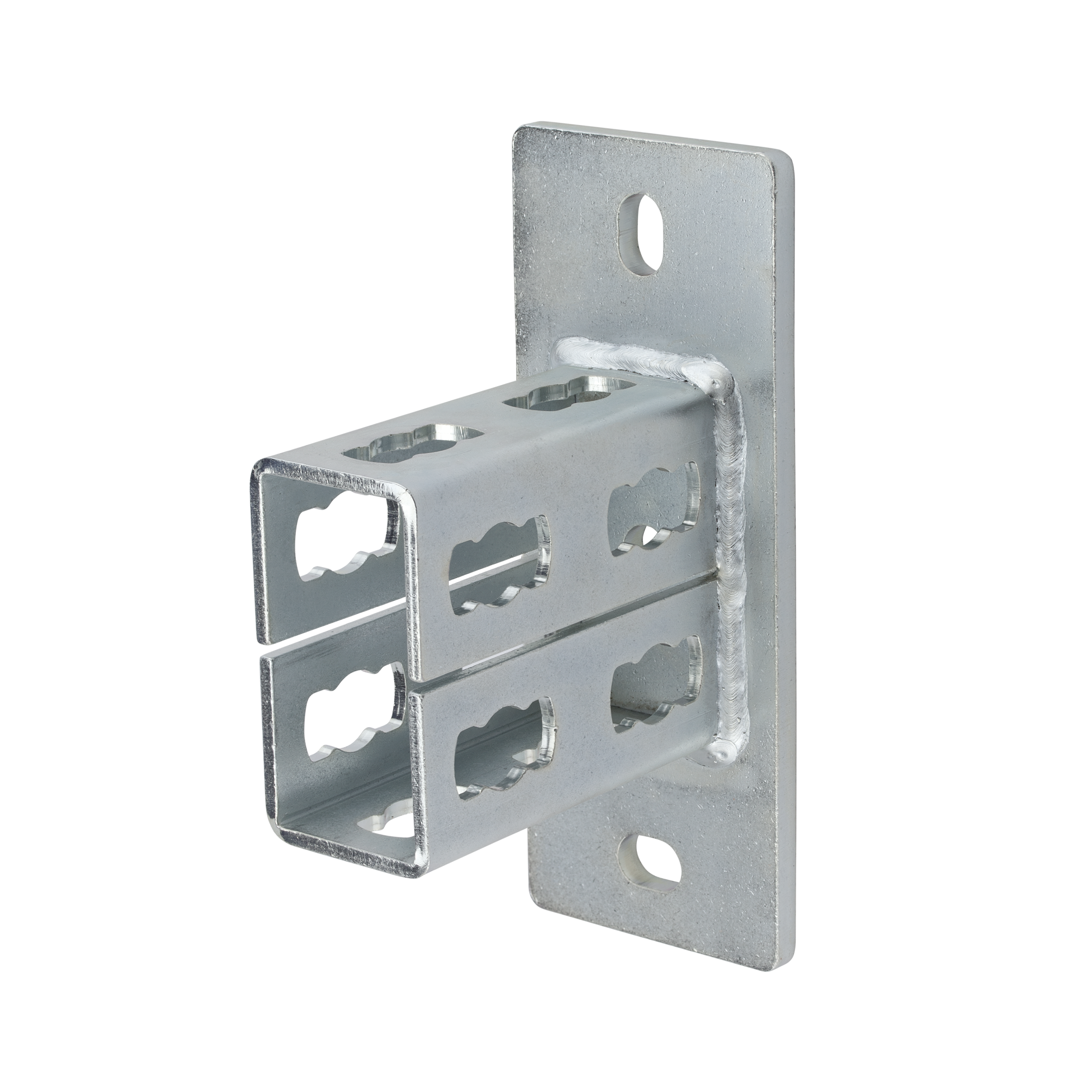 • Platine double pour profils 41/82 et 41/124 avec logement antitorsion par un recouvrement des deux côtés du rail