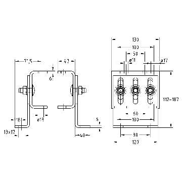 1 Kit se compose de : 2 Equerres de fixation, 2 Cornières d’adaptation, 6 Vis tête ronde collet carré M12, 6 Ecrous hexagonaux M12, 6 Rondelles pour M12. Toutes les pièces sont électrozinguée.