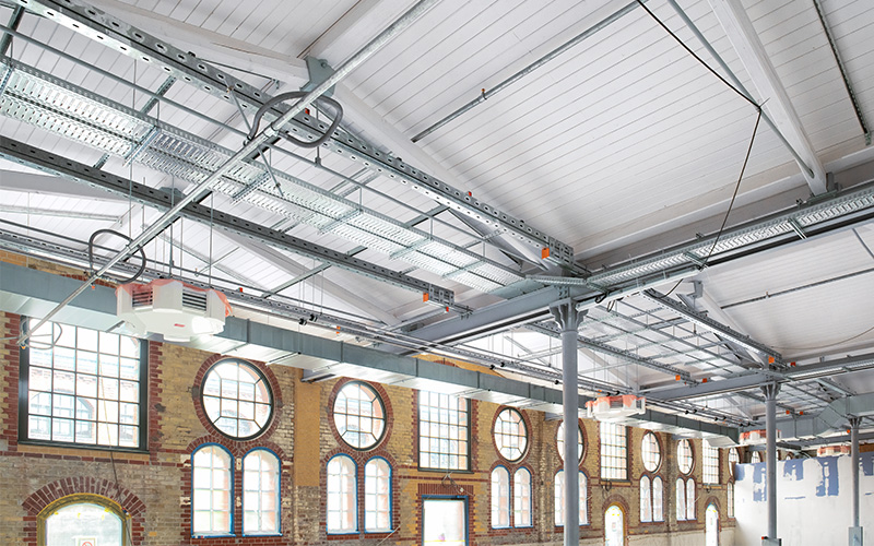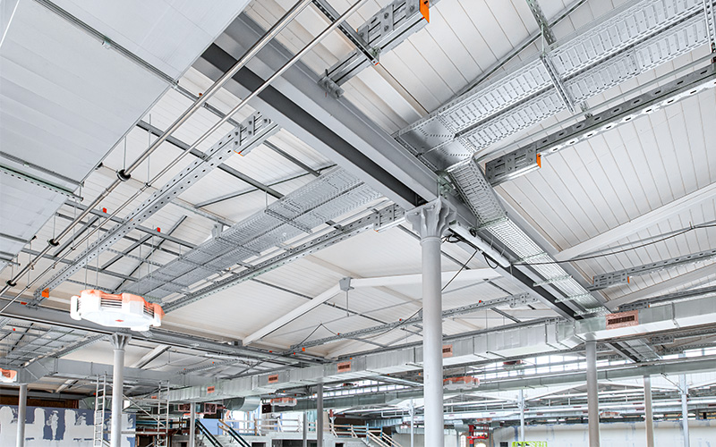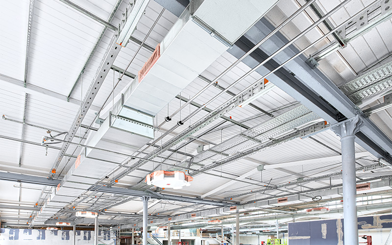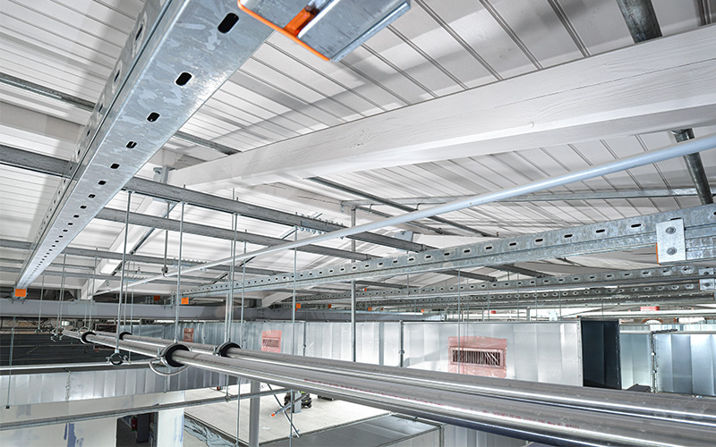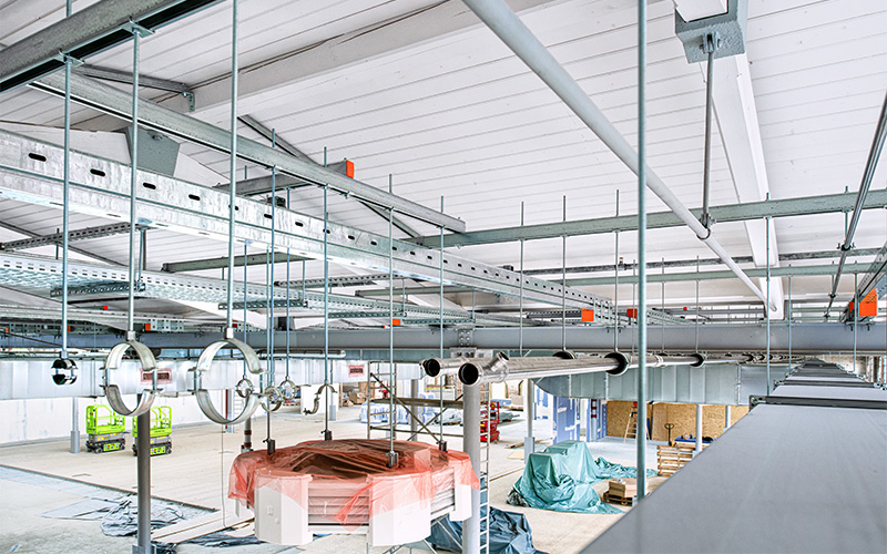 En raison de la capacité de charge limitée du toit, MÜPRO a résolu le problème de fixation des installations de conduites à l'aide d'une grille de plafond composée de rails fixés aux poutres en acier.