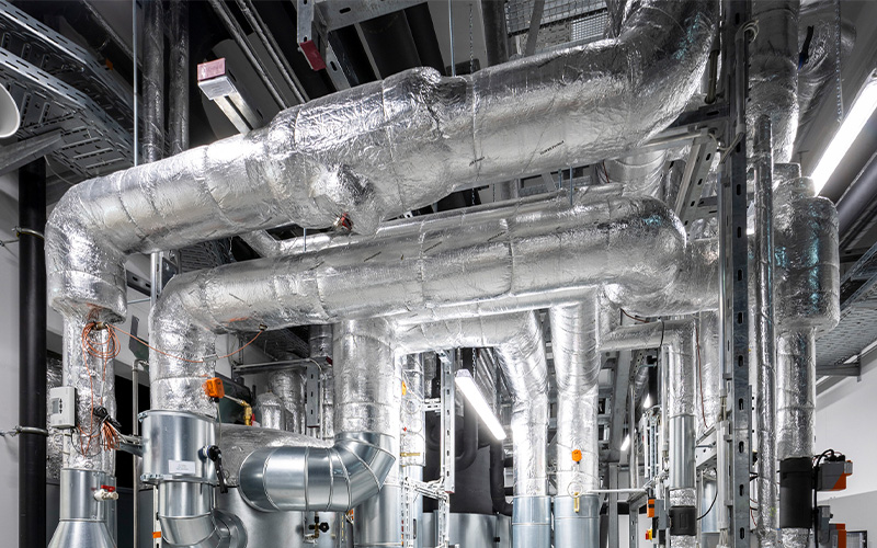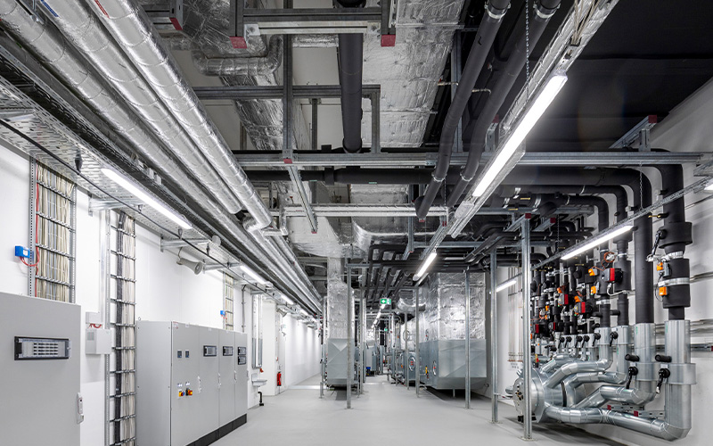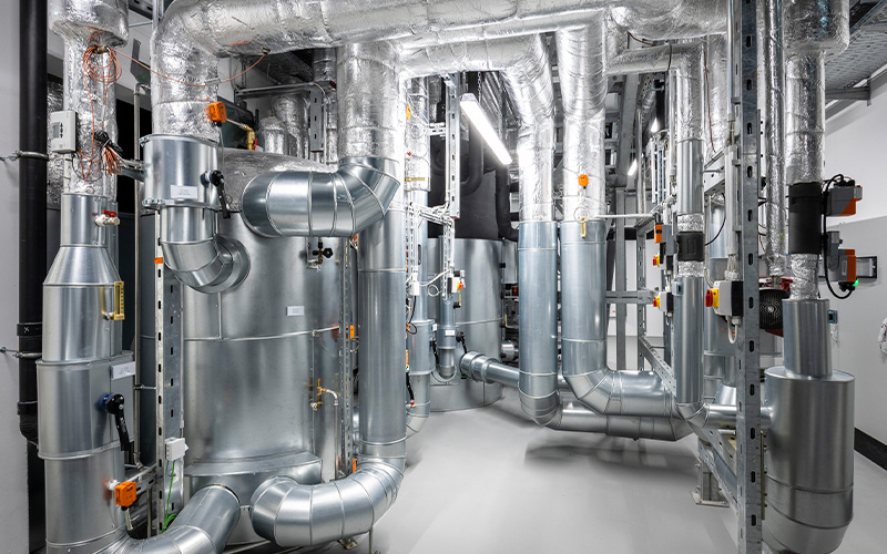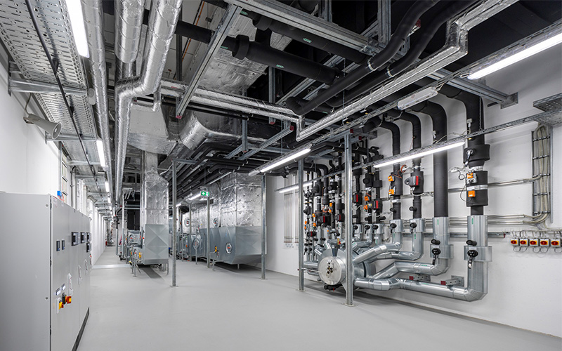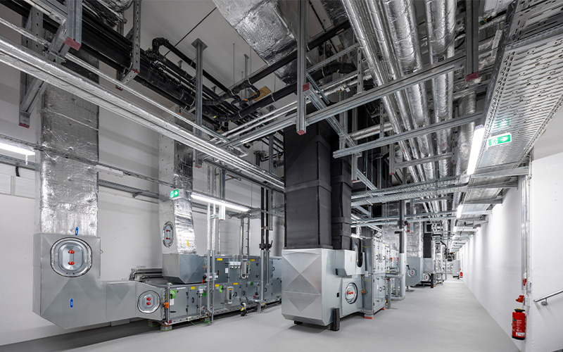 Les rails système MPR de MÜPRO ont été utilisés pour le montage des tuyauteries. Ceux-ci offrent une structure porteuse idéale pour les conduits de ventilation et de nombreuses possibilités de montage. À Wiesbaden, plus de 2 000 mètres de rails système ont été posés afin de garantir une fixation rapide et rationnelle des tronçons et des tracés de tuyauteries.