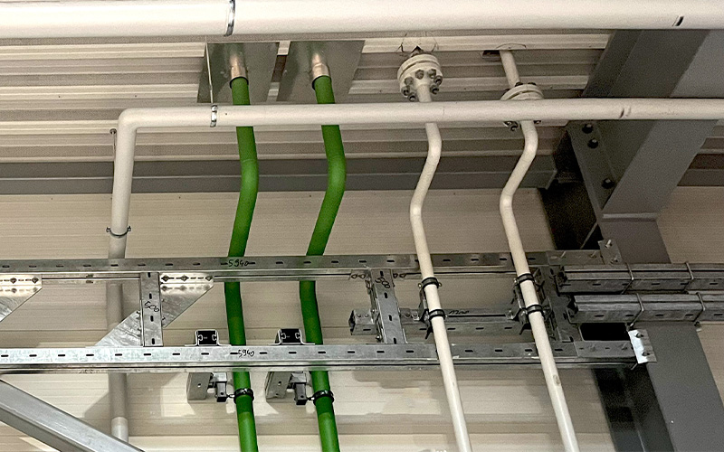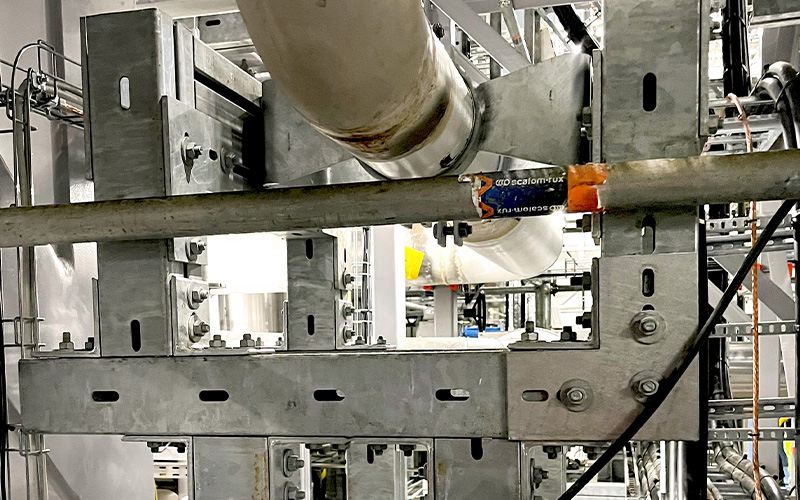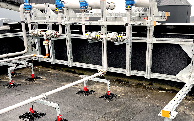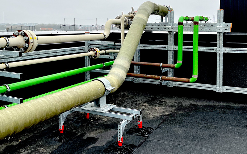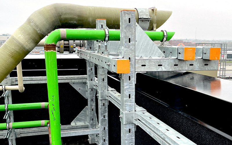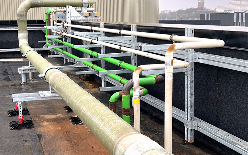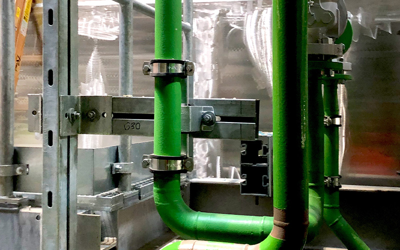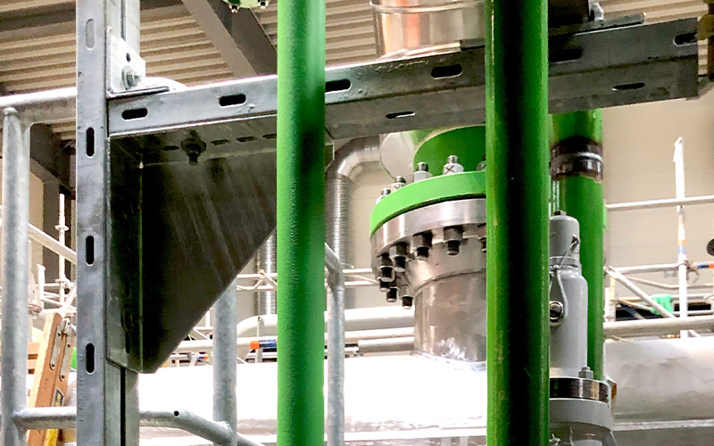 Pour la mise en œuvre de la construction de ce projet d'envergure, MÜPRO mise en grande partie sur le système porteur MPT. Celui-ci offre une solution performante pour les constructions lourdes exigeantes, telles que les installations techniques lourdes ou les tuyauteries dans la construction industrielle et la construction d'installations, tout en étant plus économique que la construction métallique conventionnelle. MÜPRO a développé le système MPT avec une rainure de fixation continue qui permet un raccordement flexible des pièces de montage et de fixation. Cela évite les travaux de soudage coûteux et le système séduit par sa simplicité d'utilisation. Le montage sans soudage permet de réduire les coûts et augmente la flexibilité sur le chantier. Un facteur qui a été déterminant dans le projet d'Esbjerg. En effet, les supports ont été installés en fonction des besoins. Les experts de MÜPRO ont disposé d'un délai d'environ 24 heures pour la mise en œuvre, pendant lequel ils ont pu adapter la construction de manière flexible et réaliser les plans statiques préalables. Les ingénieurs de l'entreprise ont trouvé des solutions sur mesure et ont assuré une sécurité de planification maximale grâce à un accompagnement du montage et du chantier pendant la construction.