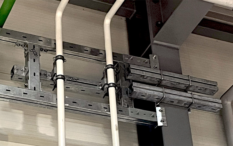 Dans le cadre de ce projet, MÜPRO fait non seulement preuve de flexibilité et d'efficacité dans la mise en place de la construction, mais présente également une grande diversité de produits. Le matériel livré représente un poids total de 59,5 tonnes. Environ 300 produits de l'entreprise sont utilisés, notamment des colliers de serrage à vis, des ancrages haute performance, des profilés porteurs, des étriers de rail, des équerres de console et des rails système dans différentes versions. Plusieurs centaines de mètres de rails système MPC 38/40 et 40/60 en version galvanisée à chaud ont ainsi été installés. Les graduations latérales et sur le côté rainuré ont non seulement facilité l'alignement des éléments de fixation, mais ont également permis de découper facilement les profilés sur place. De plus, les rails se caractérisent par leur grande rigidité à la flexion sous charge. La galvanisation à chaud conforme aux normes protège le matériau contre la corrosion. Cela vaut également pour les plus de 400 profilés porteurs MPT Q100 galvanisés à chaud, d'une longueur de six mètres et d'une épaisseur de 3,5 millimètres.