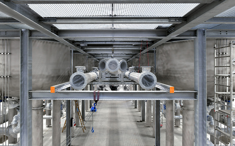 Les travaux de construction ont commencé en 2020. Pour la construction des canalisations, on s'appuie sur la longue expérience et l'expertise de la société Weber Energie und Umwelt Service GmbH de Berlin. Afin de garantir une fixation sûre et durable des conduites d'eau, la société Weber Energie und Umwelt Service GmbH a utilisé des constructions lourdes de haute qualité de MÜPRO. Ensemble, des solutions à long terme ont ainsi été trouvées pour le projet et mises en œuvre avec succès.